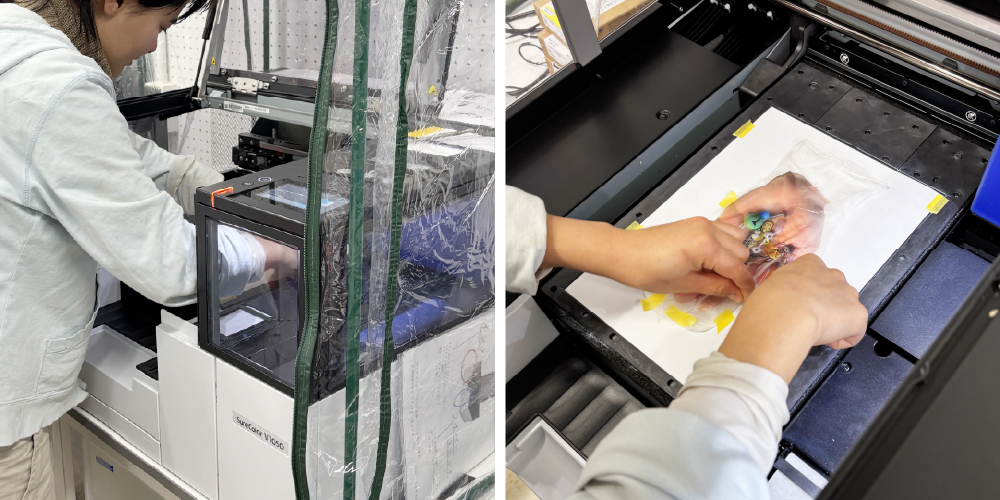 その中で、ガーメントプリンターとUVプリンターは比較的想像しやすく、「これで何ができるか」が学生にも伝わりやすいなと感じ導入を決めました。