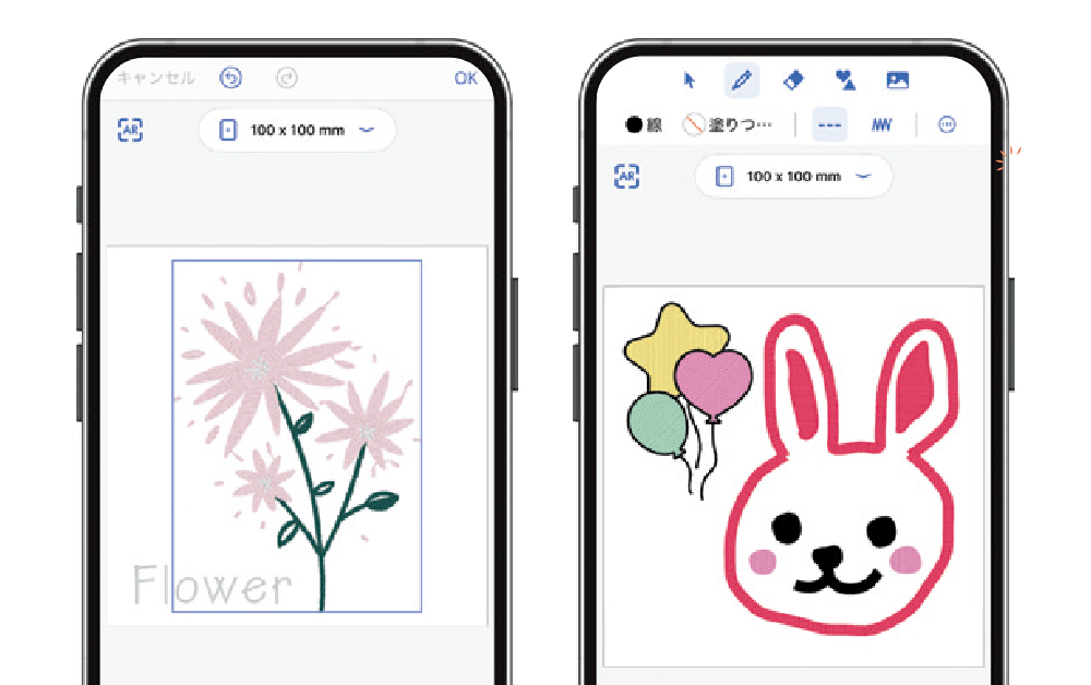 アプリ上でイラストを描いたり、自分で描いたイラストをアプリに取り込んで刺しゅうデータに変換したりすることができます。(※一部有償)