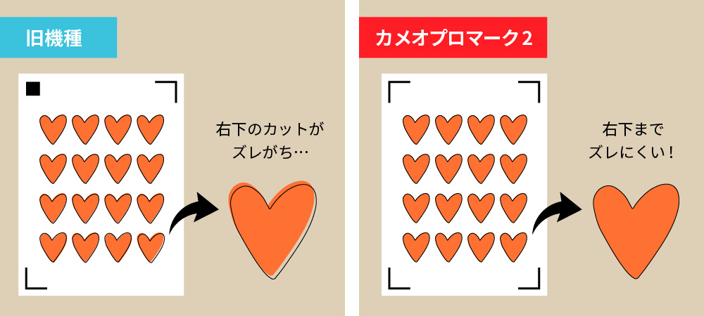 今までのカメオシリーズはトンボマークが3点でしたが、カメオプロマーク2は4点に進化。印刷とカットがズレやすかった右下エリアまでカバーでき、カットのズレを削減します。