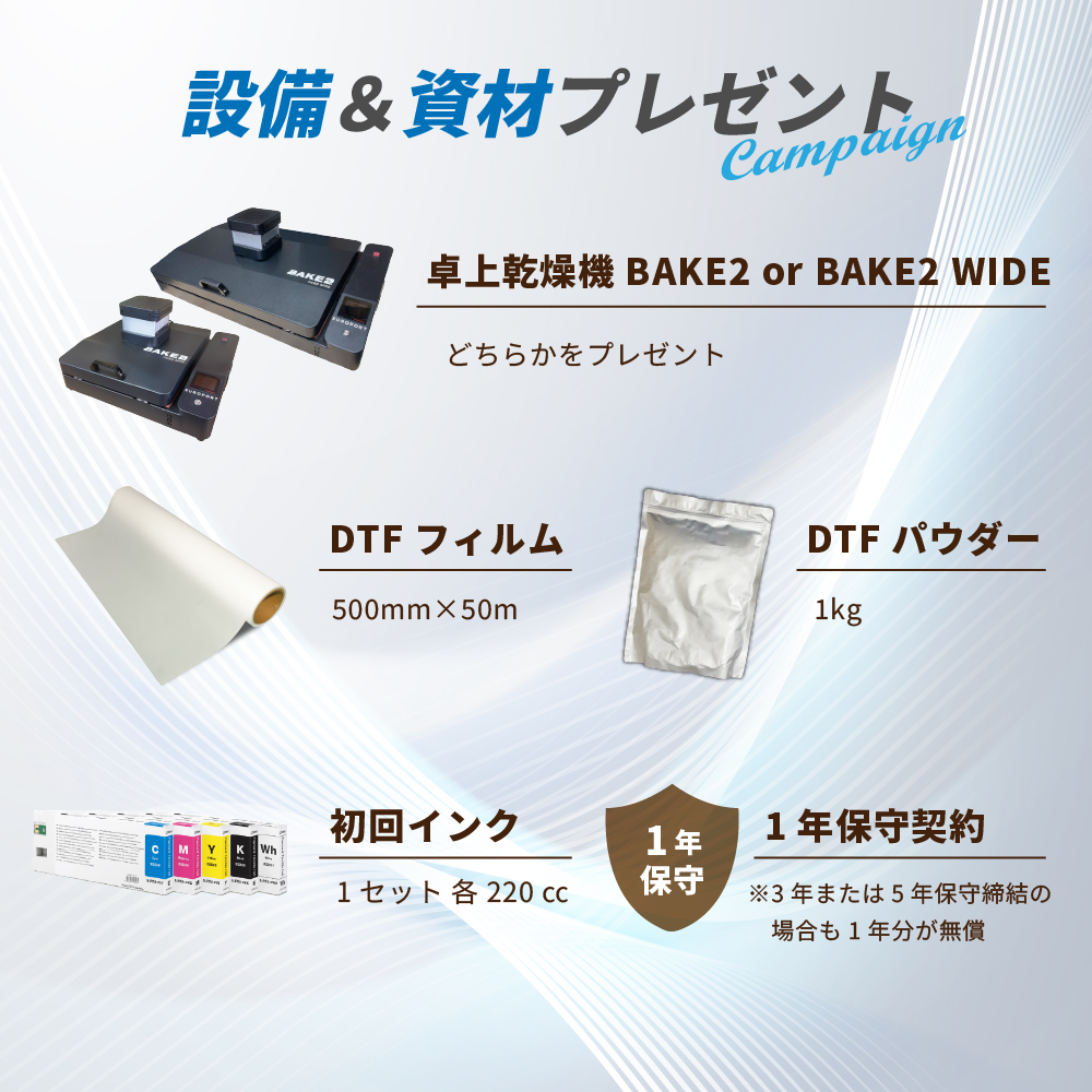 さらに今回、最大18万円(税別)相当の卓上乾燥機「BAKE2」または「BAKE2 WIDE」もプレゼント。DTFに必要な設備・資材が一式揃うため、導入後すぐに制作・販売をスタートできます。