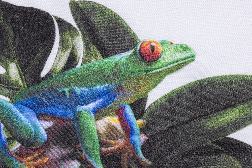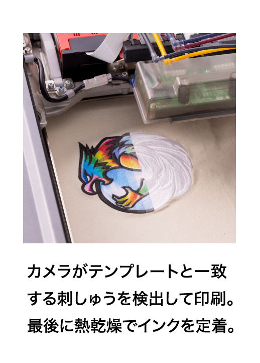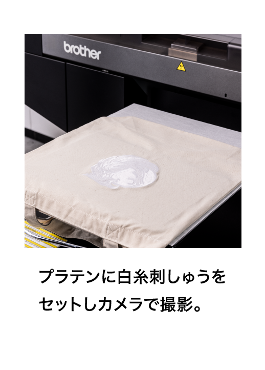 ブラザーのガーメントプリンターに搭載されたプリントヘッド技術と、AccuLine Xの自動位置合わせ機能により、白糸の刺しゅうに対してインクジェットでフルカラー印刷を行うDTE(Direct to Embroidery)を実現します。
