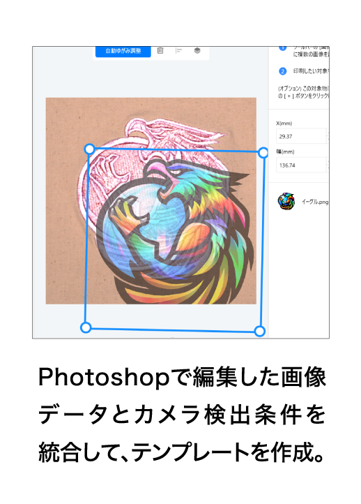 高解像度カメラで撮影した対象物の画像を解析し、エッジや特徴点から高精度テンプレートを作成可能。作成したテンプレートを用いて、印刷データを自動で配置・位置合わせします。