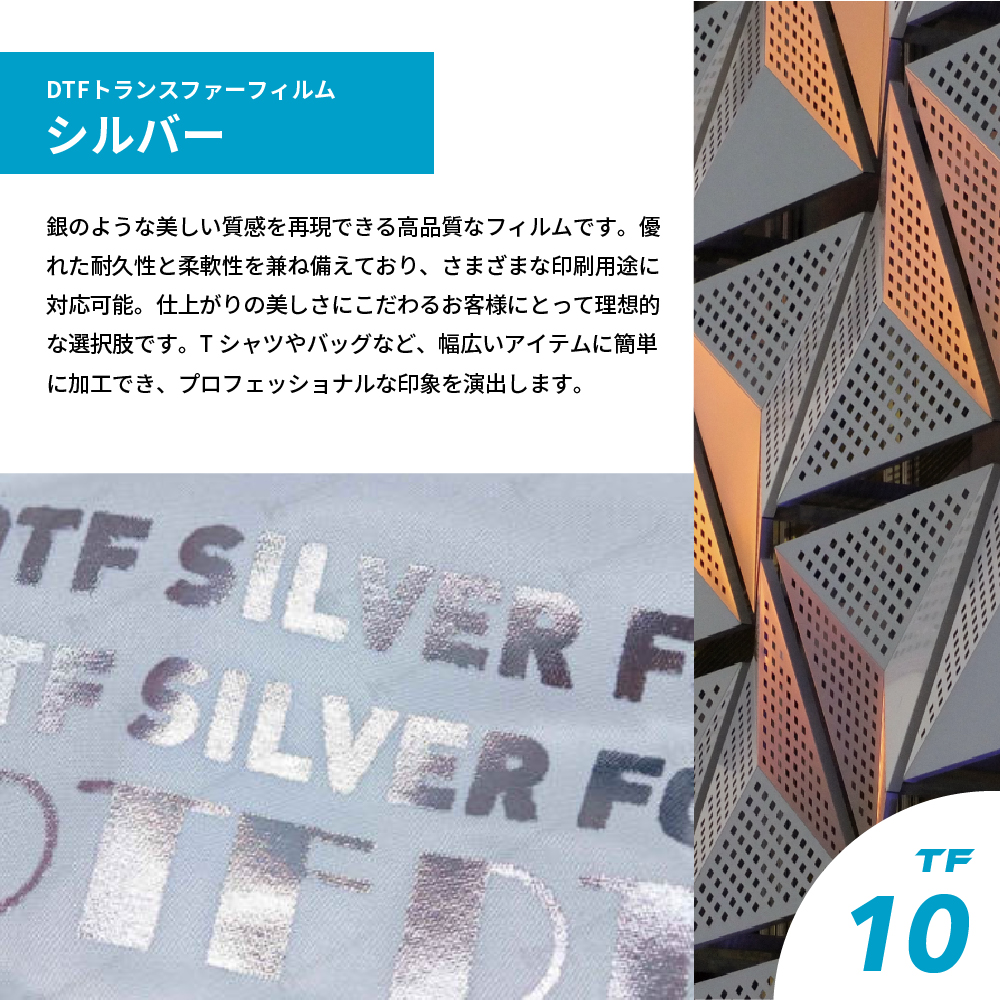 銀箔のような美しい質感を再現できる、高品質なDTF用トランスファーフィルムです。