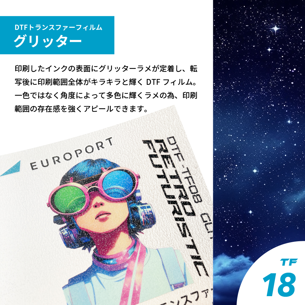 印刷したインクの表面にグリッターラメが定着し、転写後に印刷範囲全体がキラキラと輝くDTFフィルムです。DTFインクのみでは表現できない、特殊な仕上がりを実現できます。