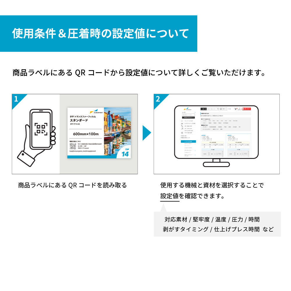 未使用の転写フィルムは、直射日光を避け、密封された室内(温度20~28°C、湿度40~60%RH)で、元の包装のまま保管してください。