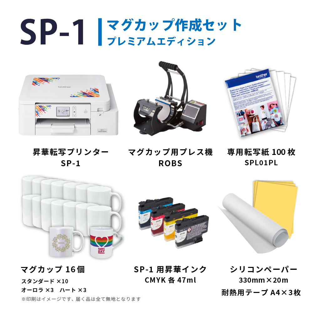 昇華転写プリンター「SP-1」と、マグカップ専用アイロンプレス機「ROBS」をセットにしたお得なスターターキットに、ブラザー純正の消耗品を追加した充実のマグカップ作成セットです。