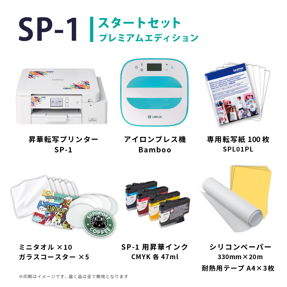 昇華転写プリンター「SP-1」と、転写に欠かせないアイロンプレス機をセットにしたお得なスターターキットに、純正の消耗品を追加した充実のセットです。