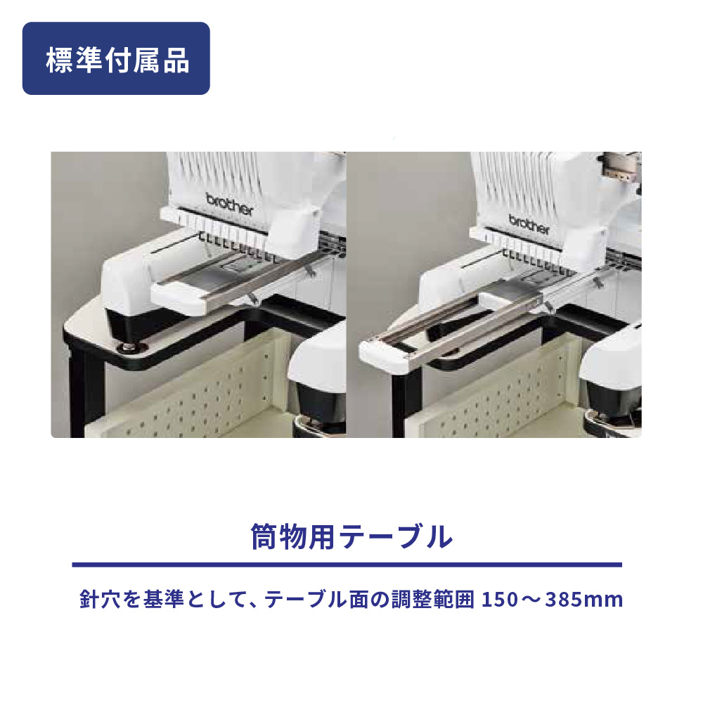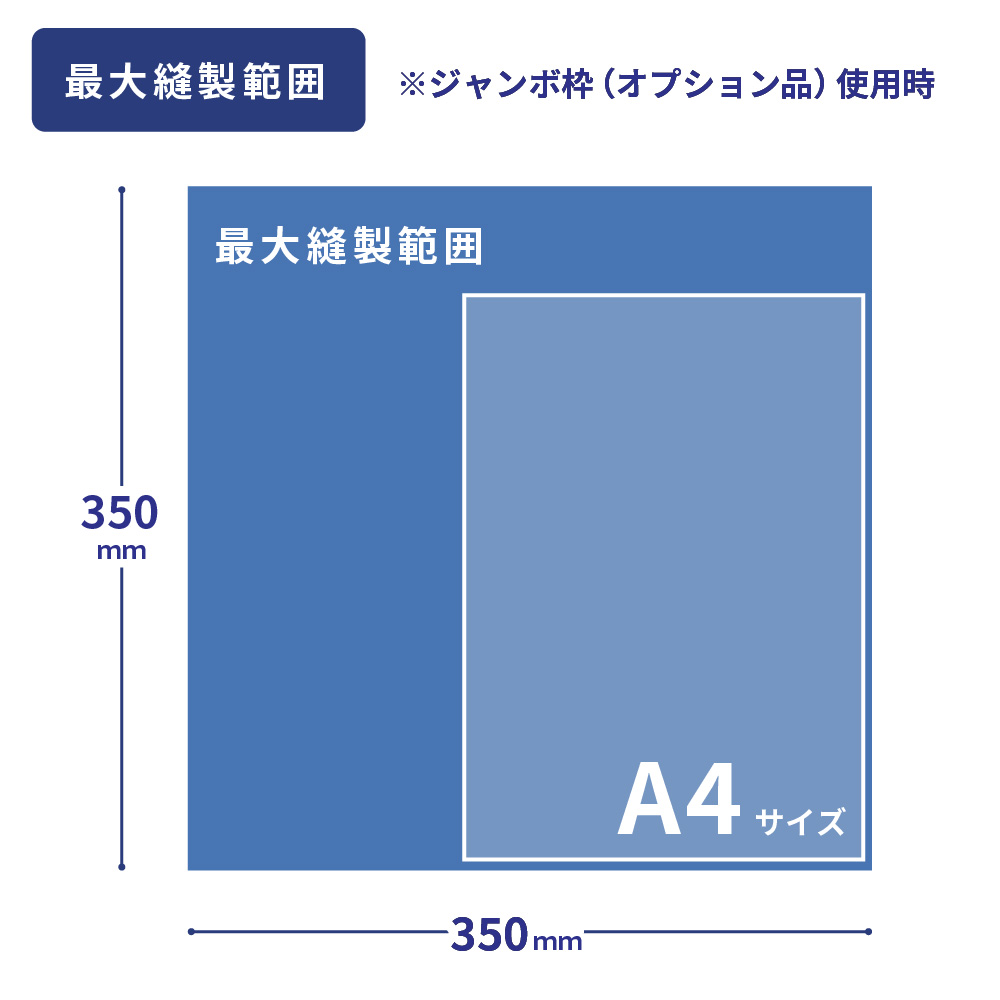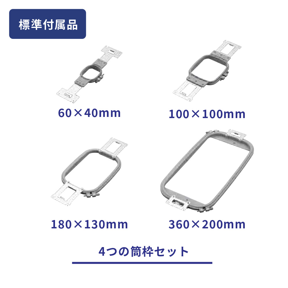 最大縫製範囲 | 200×360mm(同梱筒枠) 360×360mm(ジャンボ枠) 60×360mm(ワイド帽子枠) |