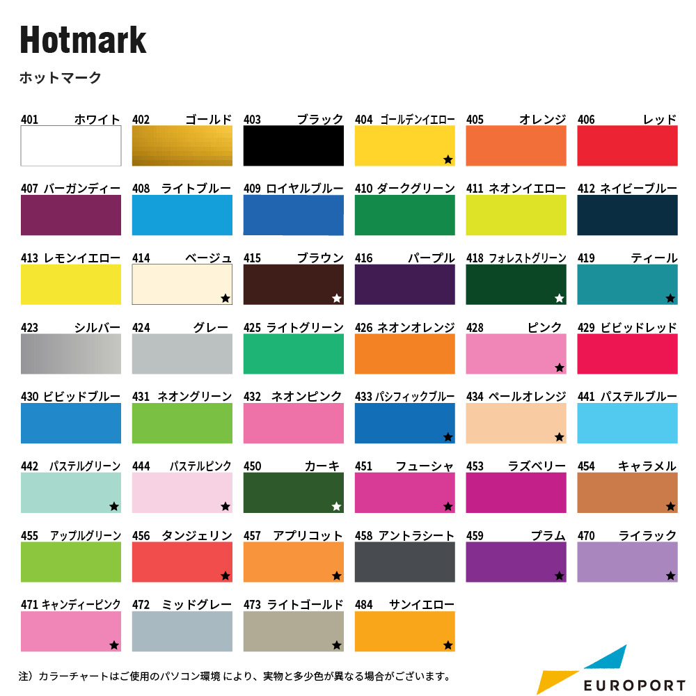 • ホットマークは非常に薄く、小さく細かなデザインをカットすることができます。表面はマット調で仕上げられています。カラーバリエーションも豊富で 綿・ポリエステルに圧着可能です。