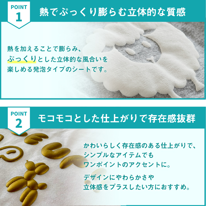 熱を加えることで膨らみ、ぷっくりとした立体的な風合いを楽しめる発泡タイプのシートです。。