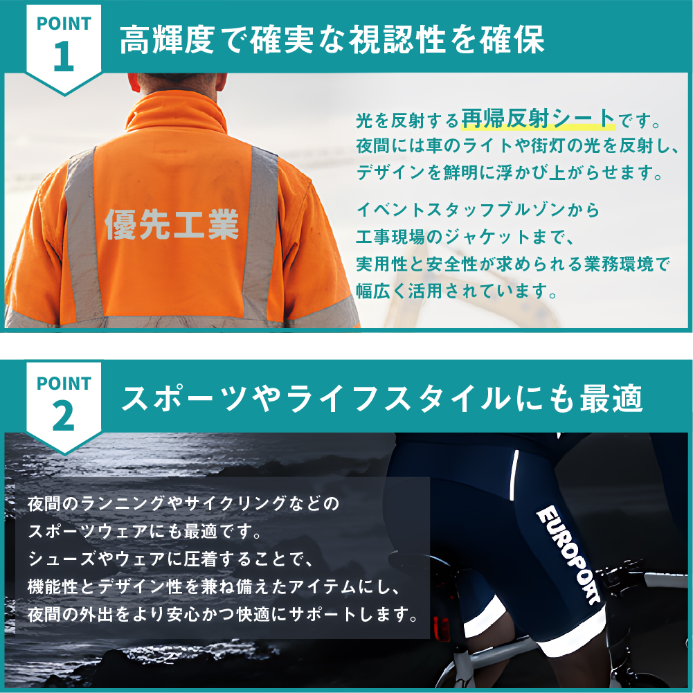 夜間のランニングなどのスポーツウェアにも最適です。