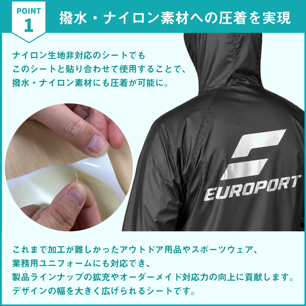 通常のシートと貼り合わせて使用することで、撥水性やナイロン素材にも圧着が可能になります。 これまで加工が難しかったアウトドア用品やスポーツウェア、業務用ユニフォームにも対応でき、 製品ラインナップの拡充やオーダーメイド対応力の向上に貢献します。 デザインの幅を大きく広げられるシートです。