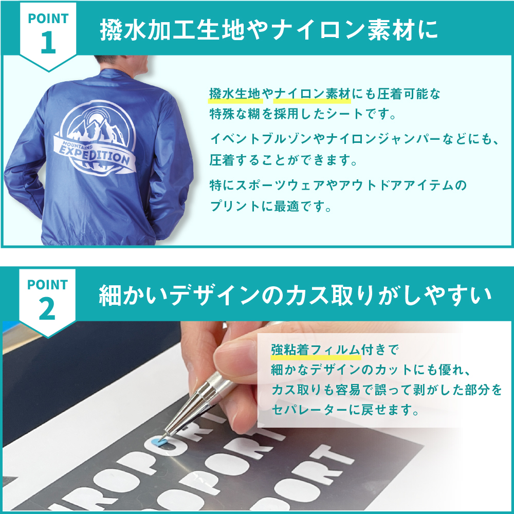 撥水生地やナイロン素材にも圧着可能な特殊な糊を採用したシートです。 従来のシートでは付きにくかったイベントブルゾンやナイロンジャンパーなどにも、しっかりと定着することができます。 特にスポーツウェアやアウトドアアイテムのプリントに最適です。