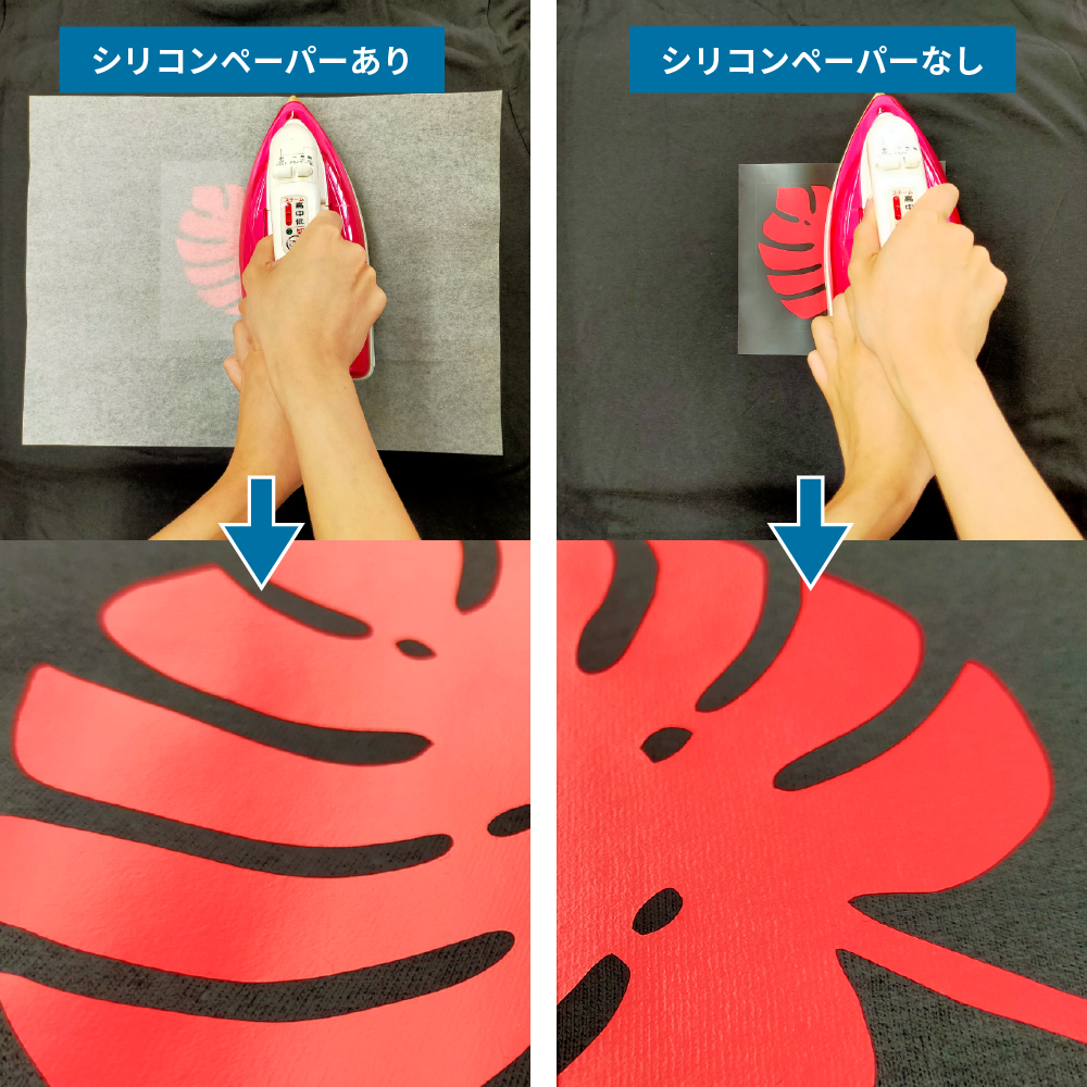 アイロンプリントを行う際にシリコンペーパー重ねて使用することにより、シートを完全に圧着して生地になじませたり、シートの表面を整えたりします。