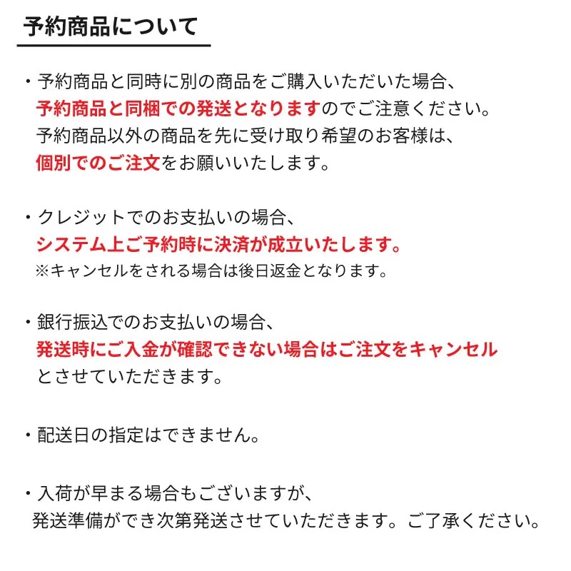 ・予約商品と同時に別の商品をご購入いただいた場合、予約商品と同梱での発送となりますのでご注意ください。