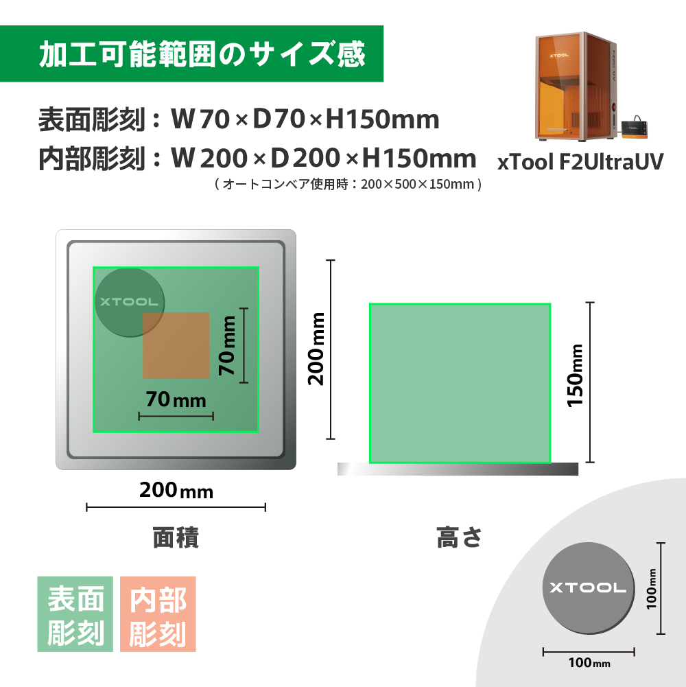| 加工範囲 | 内部彫刻:70mm×70mm 表面彫刻:200mm×200mm コンベア使用時の表面彫刻:200mm×500mm |
