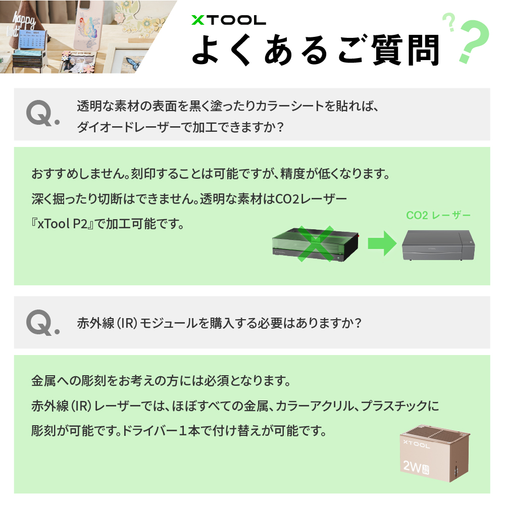 深く掘ったり切断はできません。透明な素材はCO2レーザー『xTool P2』で加工可能です。