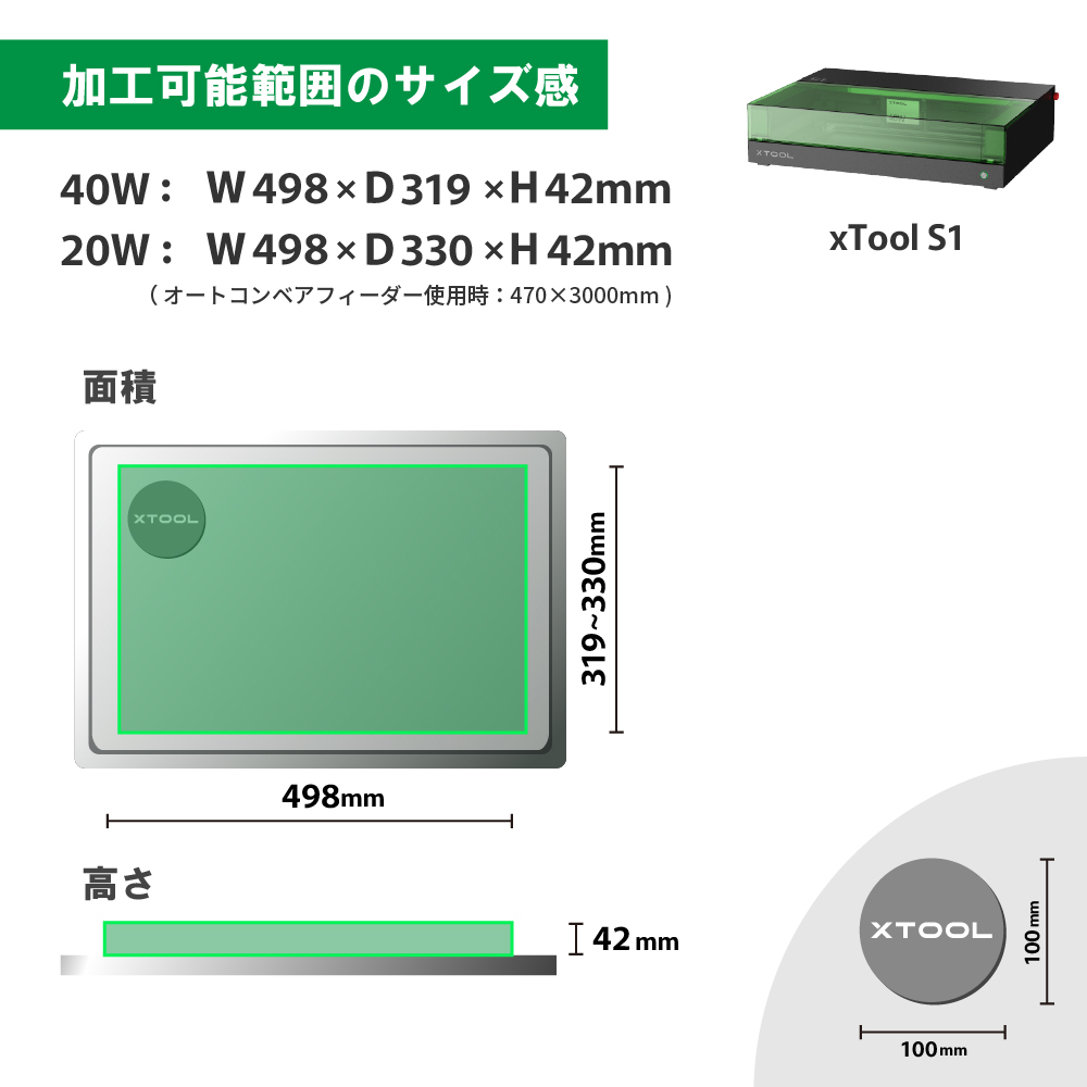| 加工範囲 | 498×319mm ※自動コンベアフィーダー使用時: 470mm×3000mmまでに拡張可能 |