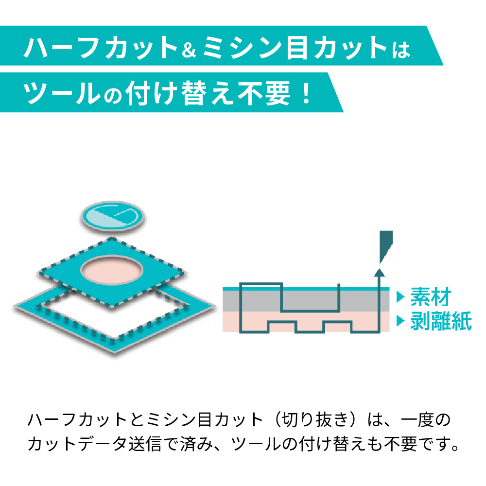 ハーフカットとミシン目カット(切り抜き)は、一度のカットデータ送信で済むので手間いらず!ツール(カッター刃)の付け替えも不要です。