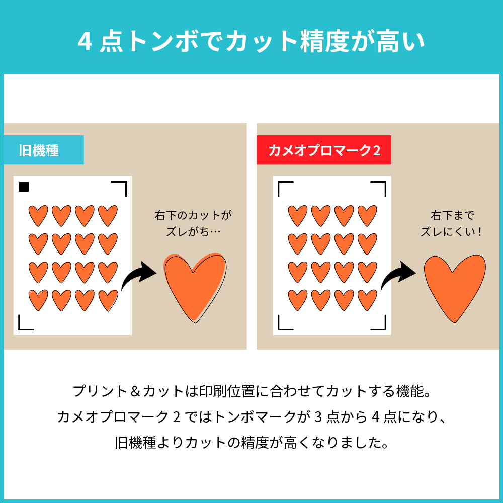 カット部分を読み込むためのトンボマークが従来の3点から4点になったことで、大判サイズでもカットのズレを抑え、高い精度を実現します。ラベルやシール、POPなど印刷と合わせた制作物にご活用いただけます。
