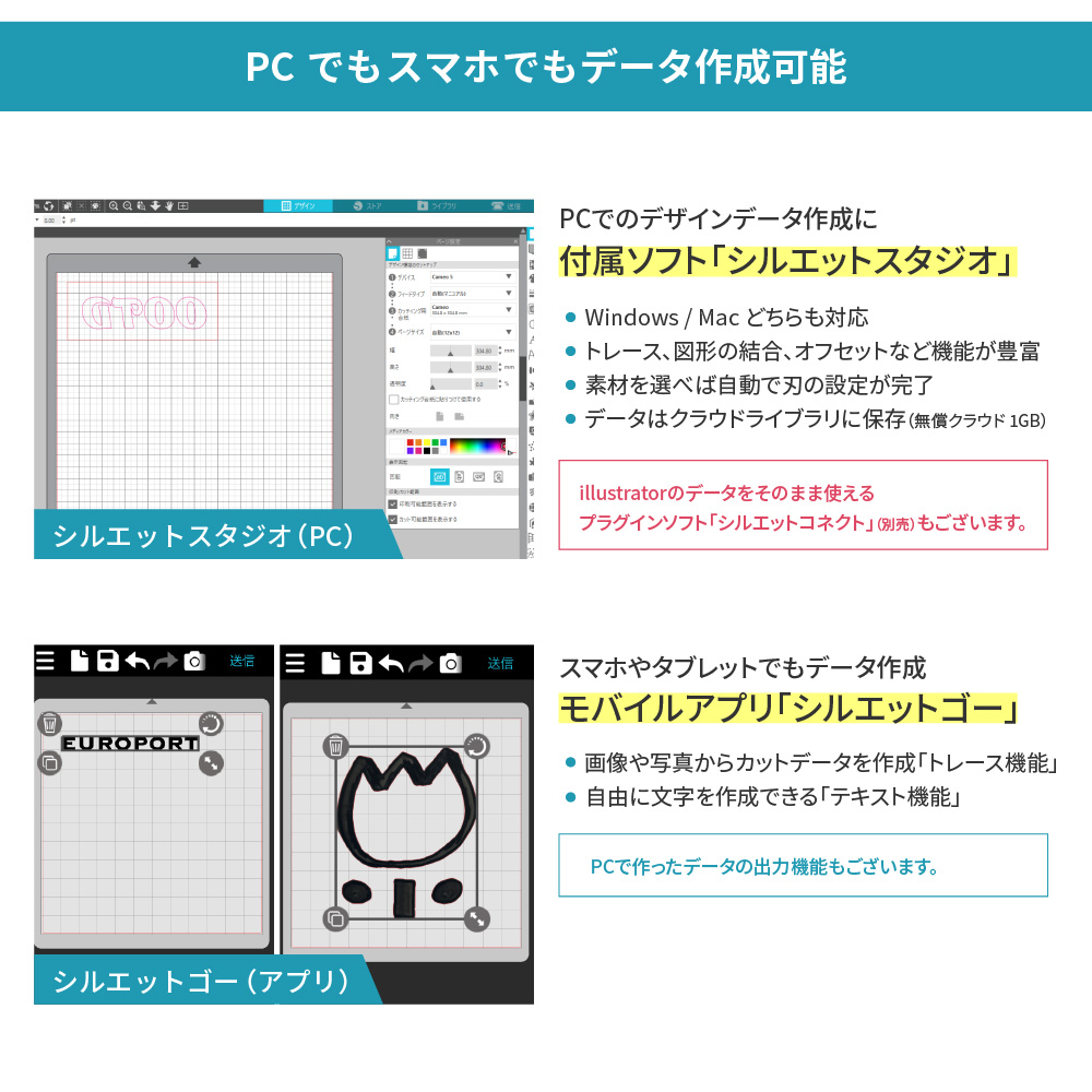 専用カットデータ編集ソフトウェア「silhouette studio(シルエットスタジオ)ベーシックエディション」が標準付属しています。