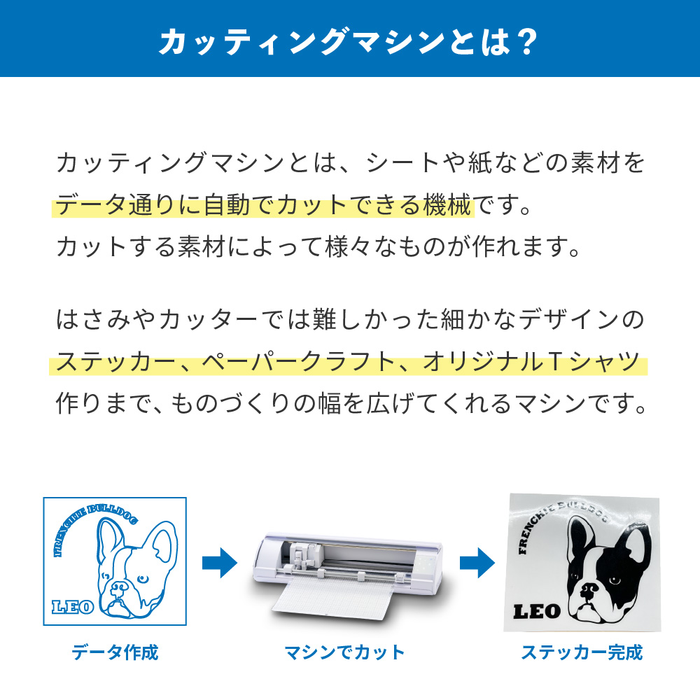 はさみやカッターでは難しかった細かなデザインのステッカー、ペーパークラフト、オリジナルTシャツ作りまで、ものづくりの幅を広げてくれるマシンです。