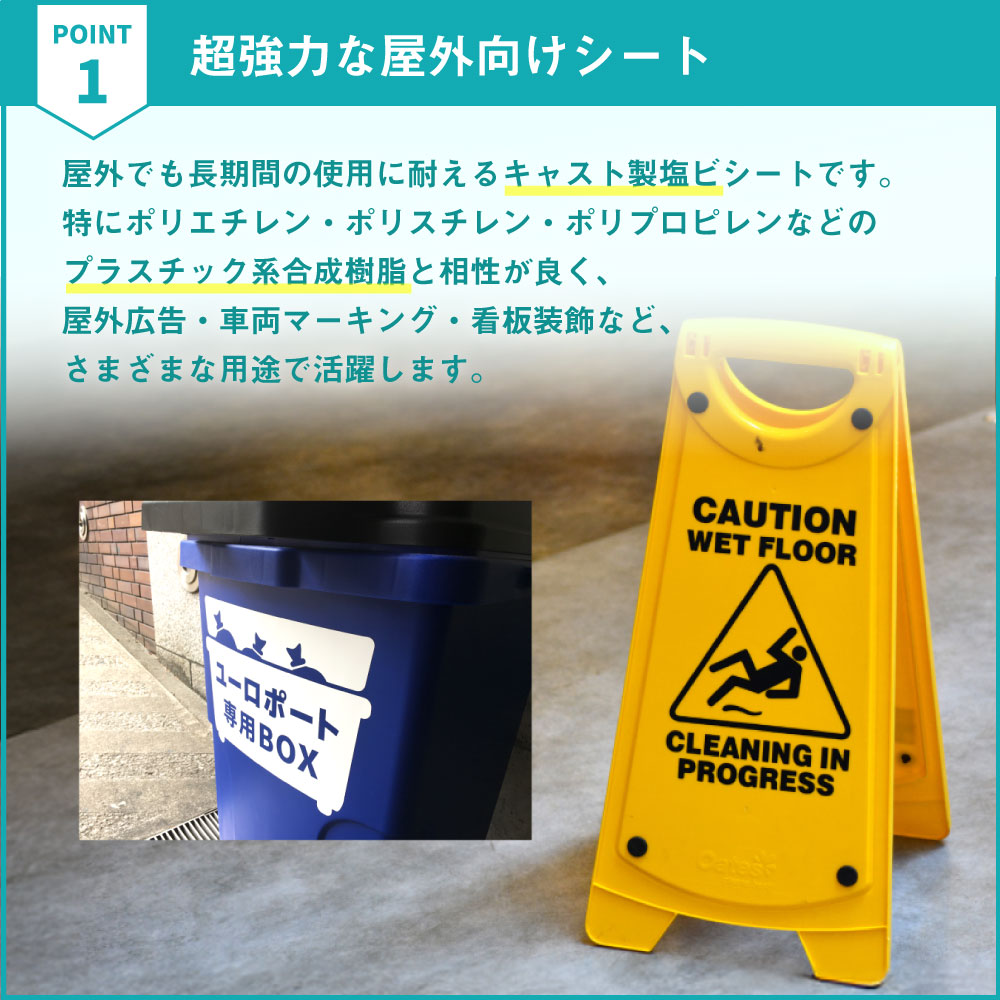 特にポリエチレン・ポリスチレン・ポリプロピレンなどのプラスチック系合成樹脂と相性が良く、屋外広告・車両マーキング・看板装飾など、さまざまな用途で活躍します。