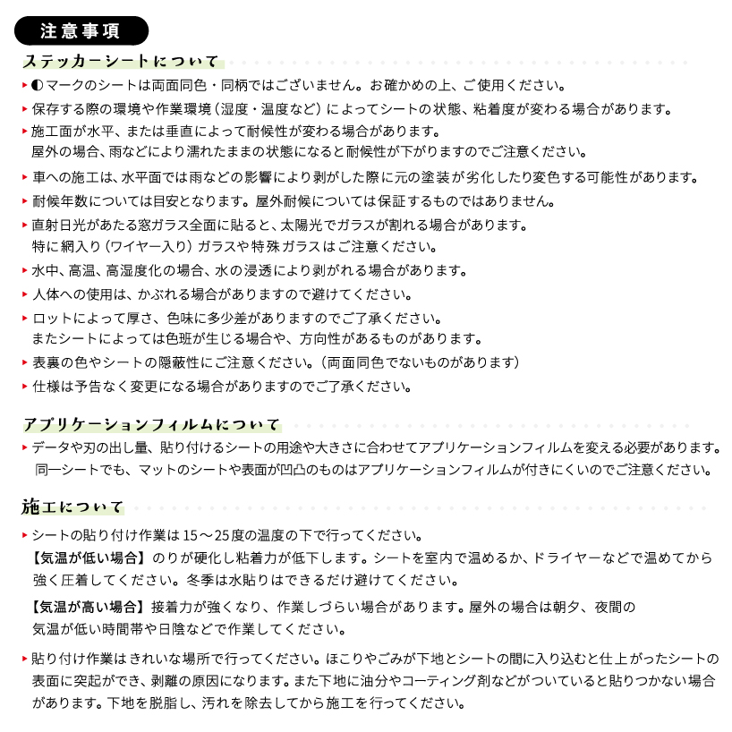 保存する際の環境や作業環境(湿度・温度など)によってシートの状態、粘着度が変わる場合があります。
