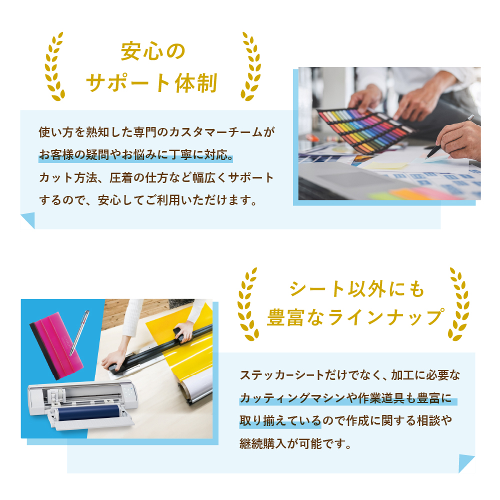 ステッカーシートだけでなく、加工に必要なカッティングマシンや作業道具も豊富に取り揃えています。
