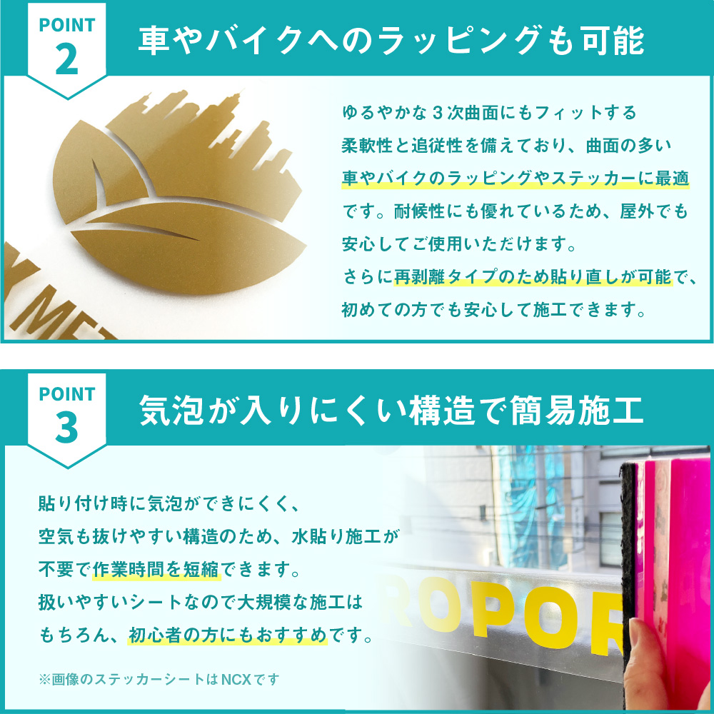 ゆるやかな3次曲面にもフィットする柔軟性と追従性を備えており、曲面の多い車やバイクのラッピングやステッカーに最適です。