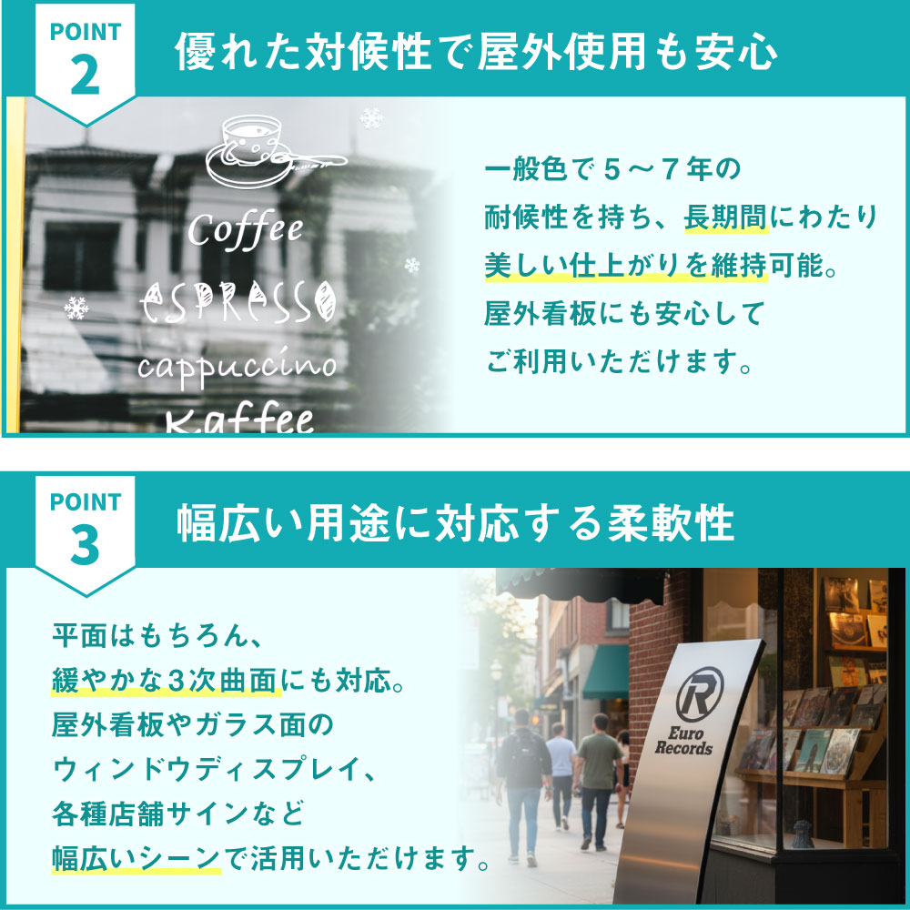 屋外看板やガラス面のウィンドウディスプレイ、各種店舗サインなど幅広いシーンで活用いただけます。