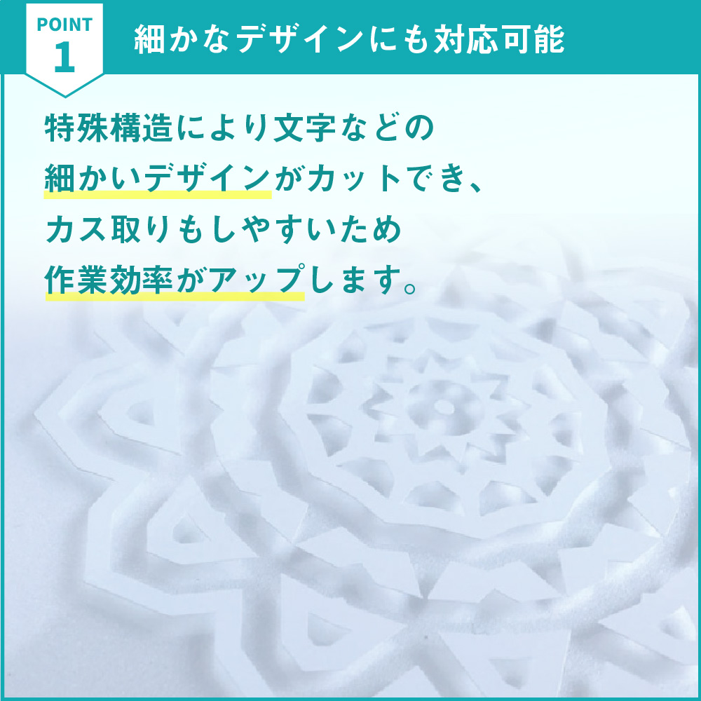 特殊構造により文字などの細かいデザインがカットでき、カス取もしやすいため作業効率がアップします。