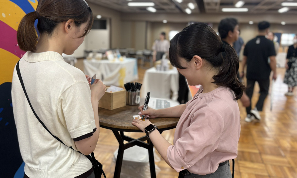 展示会当日では、受付後ろに設置したパネルをフォトブースとして、自由にメッセージを書き込める企画を行いました。